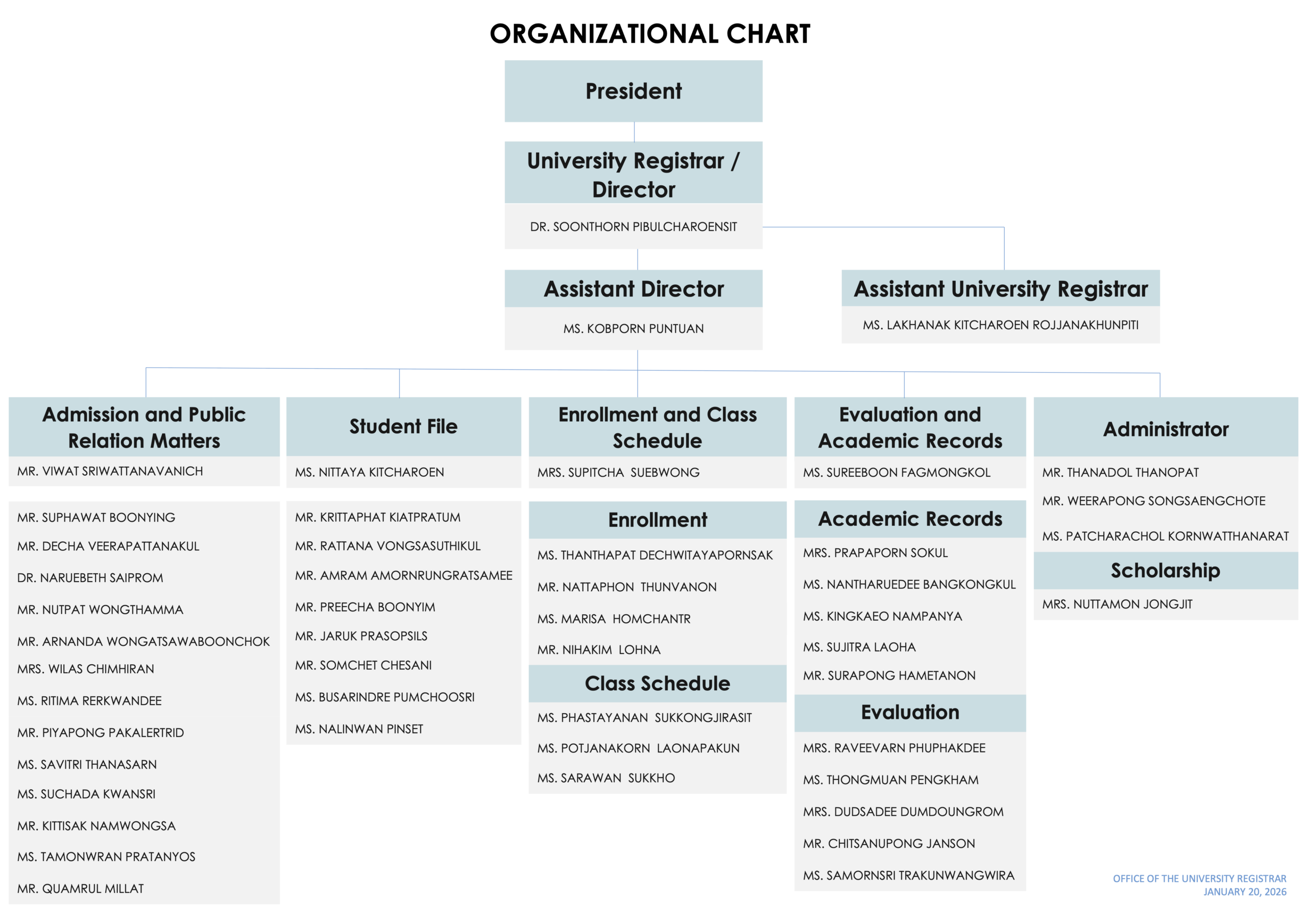 In 1990, the College changed its status to University. Accordingly, as one of the main offices offering supporting services within the university, the office was named the Office of the Registrar. Functionally and operationally the office had divided internal structures into 3 departments as follows:
